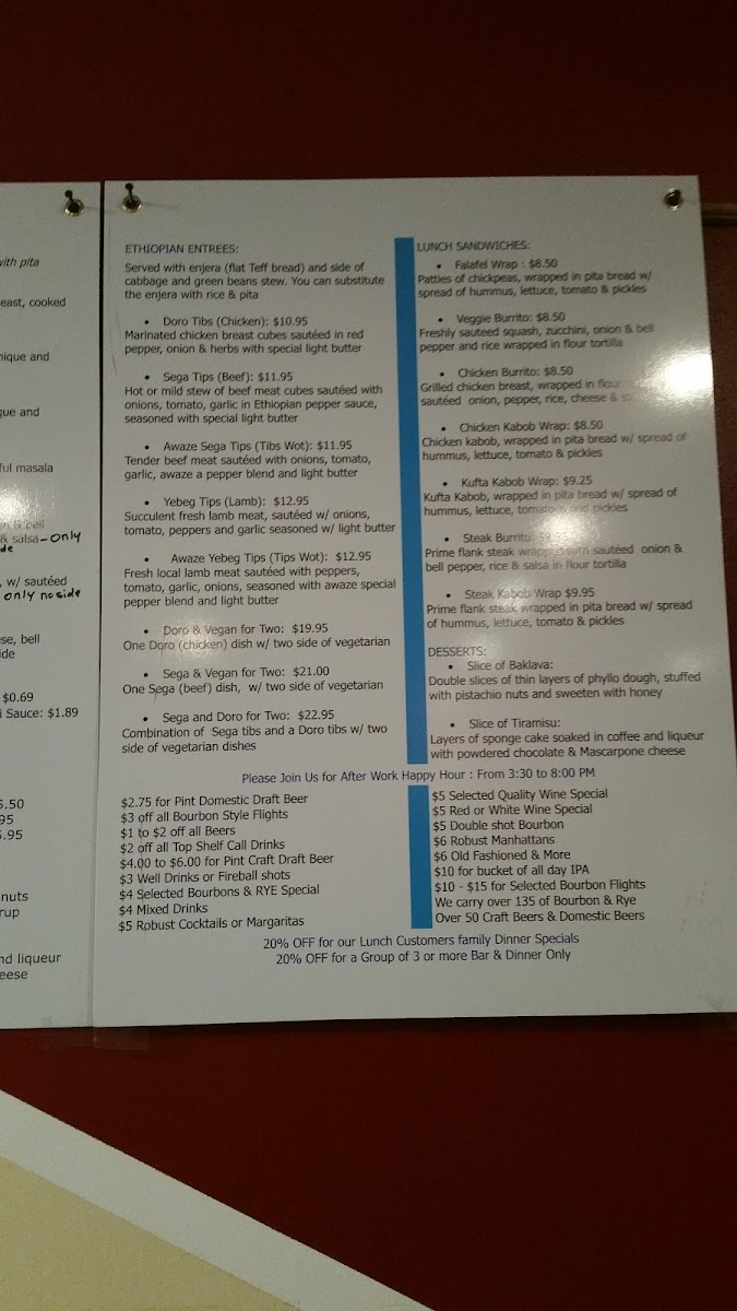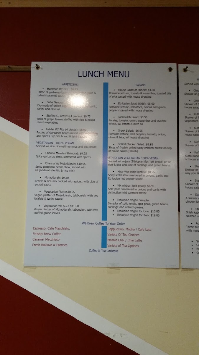 Delicious kufta kebab, wrapped in a pita bread with tahini, tzatziki, lettuce, tomato, cucumber, and pickles. Served with french fries or Jerusalem salad.